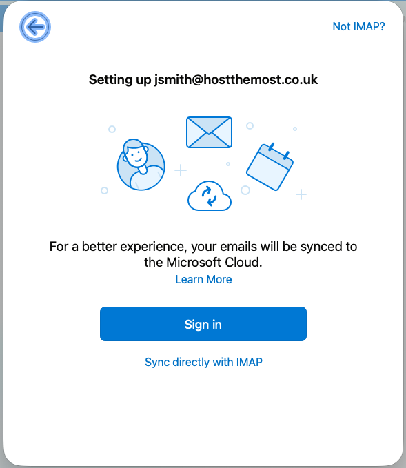 The IMAP setup window will open. We strongly recommend you click on the Sync directly with IMAP link as otherwise your username and password is sent onto Microsoft's cloud services and they connect into our servers on your behalf. Your password is no longer held only on systems under your control. The contents of your emails may be used to train AI (as Microsoft's cloud now sees the contents of all your emails).